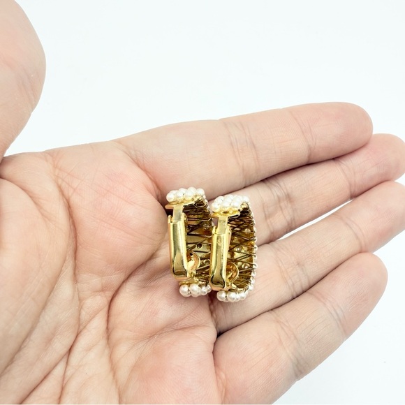 These vintage clip-on earrings feature an elegant half-moon hoop design in gold tone, adorned with faux pearl clusters for a classic and sophisticated look. Perfect for adding vintage charm to any outfit—no piercings needed!