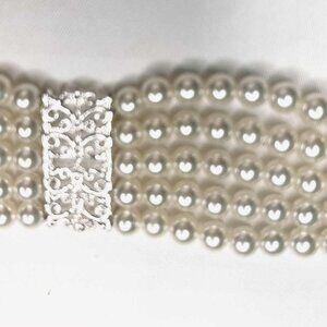 A beautifully structured vintage choker featuring multiple strands of luminous faux pearls, accented with ornate silvertone filigree panels. This striking piece sits elegantly at the neckline, adding instant sophistication to both modern and classic outfits.