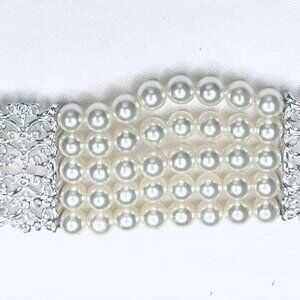 • Materials: Faux pearls, silvertone metal, filigree connectors