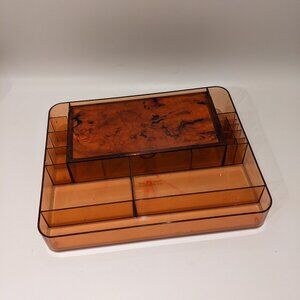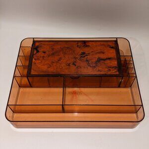 Channel vintage vanity vibes with this ultra-cool 1970s faux tortoiseshell acrylic makeup organizer, made in Hong Kong. With its rich marbled finish and clever design, this piece is both functional and fabulously retro.