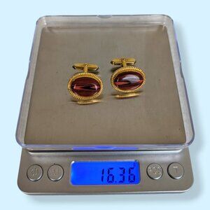 These vintage cufflinks are made of a gold tone metal and have toggle backs. The cufflinks are shaped like wide ovals with a gold crimp pattern all the way around. The stone in the center has a faux wood appearance but is warm to the touch, implying it is plastic. The cufflinks have normal vintage wear but are still very wearable.