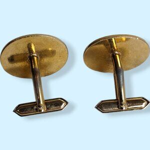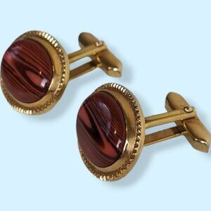 These vintage cufflinks are made of a gold tone metal and have toggle backs. The cufflinks are shaped like wide ovals with a gold crimp pattern all the way around. The stone in the center has a faux wood appearance but is warm to the touch, implying it is plastic. The cufflinks have normal vintage wear but are still very wearable.