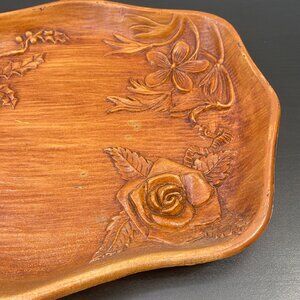 Vintage Faux Wood Tray, Four Seasons Plate, 12”X10” 1959 USA, Flower Raised Holly, Multi Products, Carved Serving Gift, Round Floral Design.