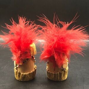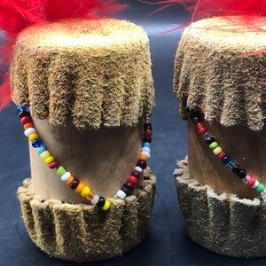 These are a unique set of shakers shaped like drums. A fluffy red feather, some beading, and leather pieces give these little shakers an indigenous appeal. A small cork is the stopper.