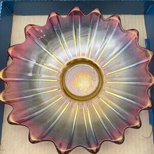 Vintage Federal Glass Celestial Gem-Tone Bowl with original box. This iridescent carnival glass piece is in very good preowned condition with no chips or cracks, but some wear to the finish. It comes complete with its original display box.