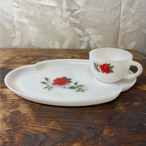 Elegant white snack set featuring a charming red rose floral design. This set includes a matching teacup and serving plate, perfect for afternoon tea or light refreshments. The delicate rose motif adds a classic touch to your dining collection. Set of 4, all in great condition.