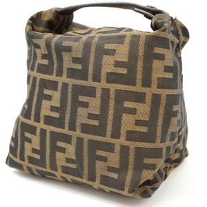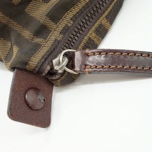 Authentic vintage Fendi pouchette in zucca logo canvas. Unlined bag in canvas nylon material. Chestnut brown leather detailing. Zipper closure with leather pull tag. Interior has embossed Fendi logo patch. Interior seams are bound with contrasting Fendi logo material. Bag is in overall great condition, no rips or stains. Handle is a brown leather strap that can be opened with a pushbutton. Dimensions approximately 6.5" x 7" x 4". serial number 2257 26540 099