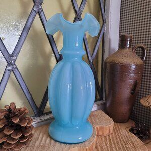 Vintage Fenton Blue Blown Glass Melon Flower Vase with Ruffled Edge