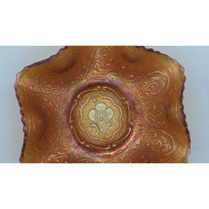 This vintage Fenton persian medallion pattern carnival glass dish is a unique find. Crafted from beautiful marigold carnival glass, it's a beautiful piece that adds a touch of sophistication to any space.