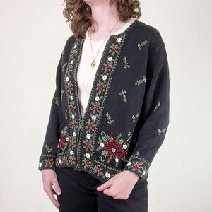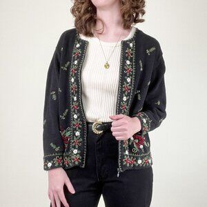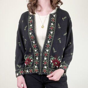 Vintage Festive Holiday Cardigan Beads Embroidered Not So Ugly Christmas Sweater