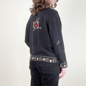 Step into the festive season with this charming vintage cardigan, beautifully adorned with intricate beading and vibrant floral embroidery, including poinsettia motifs. The detailed craftsmanship and cozy cotton knit make it a perfect statement piece for adding a touch of holiday cheer to your wardrobe.
