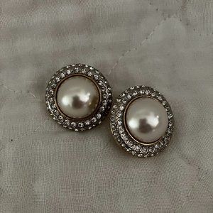 large showy faux cabochon pearl surrounded by rhinestones set in gold jewelry metal. like new or new. 1"/ 2.5cm in size clip on earrings