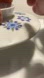 Collectible blue white with some green and purple whimsical design of a woman in a hammock (?) in a floral garden.