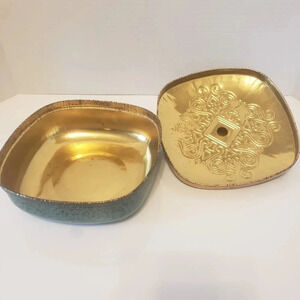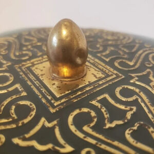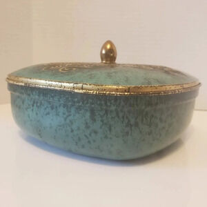 Vintage lidded finial,metal filigree green/gold biscuit tin.