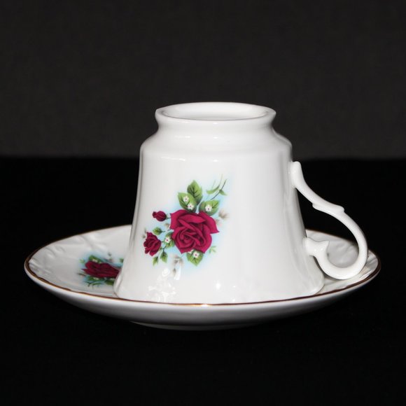 A lovely crisp white with red roses tea cup set that was made in Canada. The rim of the cup and saucer has an embossed scroll design, while the rims also have a gold trim.