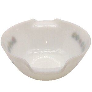 Vintage Fire King Anchor Hocking Summerfield Mod Flowers Casserole Dish Bowl. Glass. White with orange, green and yellow flowers. Measures approximately 11.5” across and 4.5” high. Made in USA. Minor scratches and marks on the outside.
