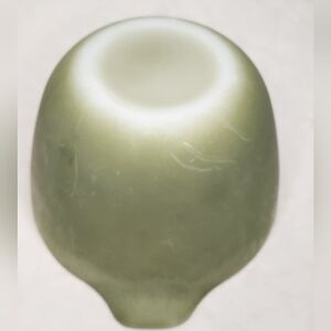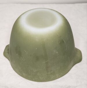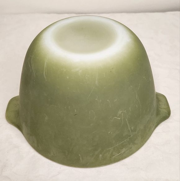 Matte olive green small spouted handle mixing bowl 'Colonial Hearth', by FireKing from Anchor Hocking.