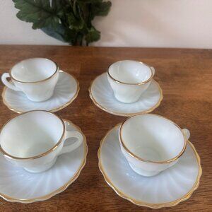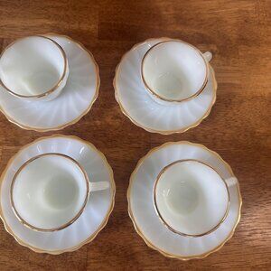 Vintage Fire-King Gold Trim Milk Glass Tea Cups and Saucers‎ Set Anchor Hocking