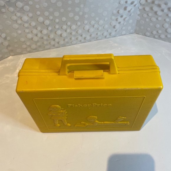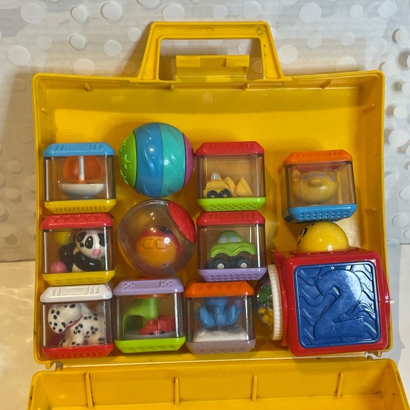 Vintage Fisher Price Peek a Boo Blocks Sensory Toys, stacking in yellow 1980 Fisher Price plastic carrying case