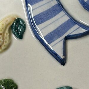 Plate is decorated with raised small vegetables in the centre with an embossed striped blue & white bow.