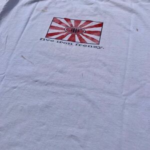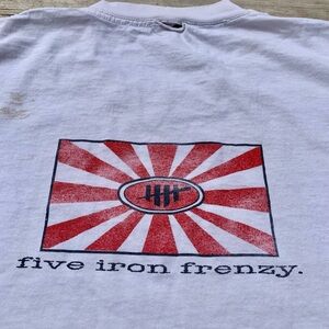 Step back in time with this awesome vintage Five Iron Frenzy band t-shirt! This unique tee features a cool comic book art graphic on the front, showcasing a fun and quirky design that fans of the iconic ska punk band will love. The back proudly displays the "Five Iron Frenzy" logo with a distinctive red and white sunburst design.