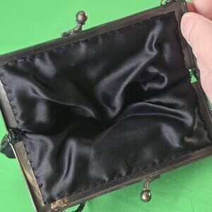 Purse is about 6 X 5". hardware and chain are metal, antique brass tone. Beading is one side only. It's fairly darn adorable. Clean inside.