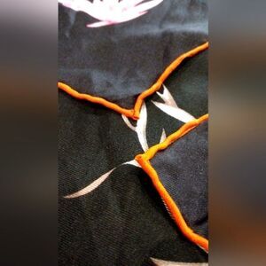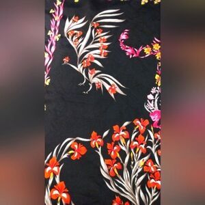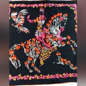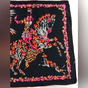 Vintage 💯 Silk black scarf with vibrant pink,yellow and red floral patterns,to create a woman riding a horse. Perfect for adding a touch of color to any outfit.