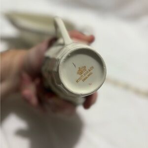 Enhance your dining experience with this elegant ceramic gravy boat and pitcher set. Featuring a charming floral design in cream and blue, this set adds a touch of sophistication to any table setting. See photos for wear. Wear due to age and previous use.