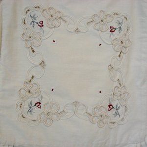 - pillow case has a shabby chic feel to it with embroidered flowers throughout in colours of red, pink and green and open lace on an off white cream fabric