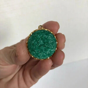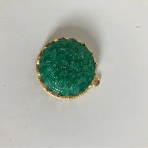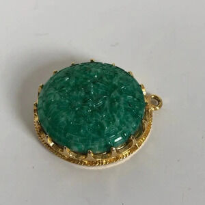 I believe this is made out of either a carved stone or more than likely a pressed slag glass. Gold tone frame around with a spot on the top to hang on a chain. Very good vintage condition- no issues to note.