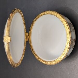 Vintage Hand-painted small floral porcelain round lidded hinged trinket box with an iridescent sheen.