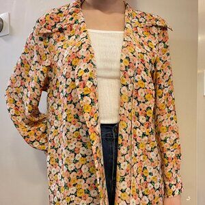 Add a touch of retro charm with this vintage floral long sleeve blouse! With its vibrant yellow, pink, and green floral print, this top evokes groovy '70s-80s vibes. The silky polyester-like feel makes it perfect for layering or wearing on its own for a relaxed, boho look.
