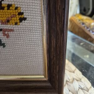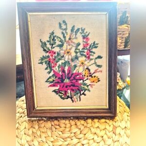 Vintage Floral Needlepoint Art in Wooden Frame 10"x12"
