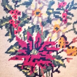 Beautiful floral needlepoint art featuring vibrant flowers. Displayed in a classic wooden frame.