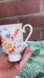 Charming porcelain mug featuring vibrant orange poppies, purple daisies, and delicate greenery. The pedestal base and curved handle give it an elegant vintage feel. Perfect for sipping coffee, tea, or displaying as a collectible piece.