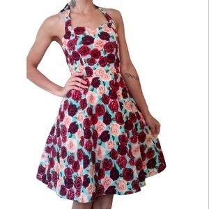 Vintage pink, red, and turquoise floral roses retro pin up dress in size small.