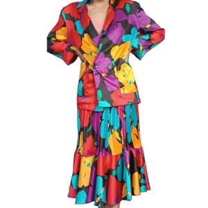 Vintage floral satin blazer and skirt set from the 1980s in red, yellow, and blue. Size Small to Medium. Excellent condition.