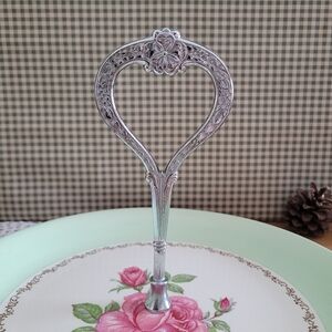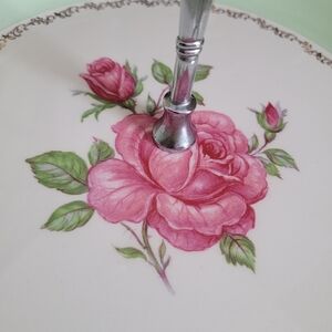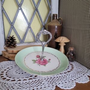 From Alfred Meakin's Elegance collection, this mid-century English elegant serving tray features a rose design surrounded by a soft green and cream color palette, highlited by a delicate gold patern frame. It's central chrome handle is ritchly adorned of astonishing art deco details. Perfect for the Cookie Fairy Fest!