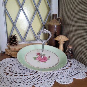 From Alfred Meakin's Elegance collection, this mid-century English elegant serving tray features a rose design surrounded by a soft green and cream color palette, highlited by a delicate gold patern frame. It's central chrome handle is ritchly adorned of astonishing art deco details. Perfect for the Cookie Fairy Fest!