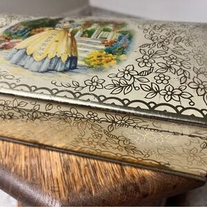 Charming vintage tin box featuring an elegant lady in a garden scene. Beautiful floral patterns adorn the edges. Perfect for storage or decor. Stamped made in England