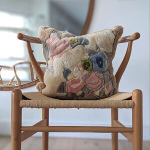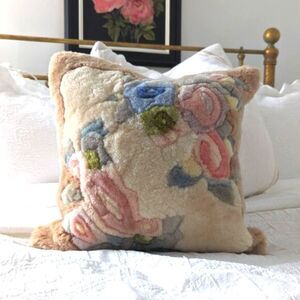 These two cuties were vintage seat cushions (yes, there are two listed seperatly). I removed and discarded the decayed cotton cover along with a thin foam insert also falling apart. The floral shearling you see here got tossed into a gentle cycle with luke warm water. All natural detergent. They cleaned up really well, as you can see all seaming held together. Probably best of all is that I was able to breath new life into them for another generation.