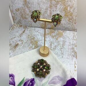 Elegant brooch and earring set with green and gold tones. Features intricate detailing and sparkling accents. Vintage Florenza from the 1950 era. Clip earrings and a signed brooch of 2 inches across. Nice vintage.