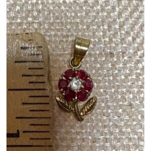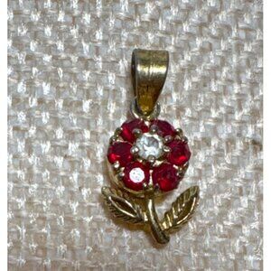 Vintage Flower Pendant Gold Tone Ruby & Clear Rhinestones