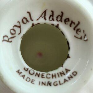 Vintage Bone China Salt & Pepper Shakers. Royal Adderly. Floral Motif. Made in England. Yellow Floral shaker has a misprint of the label as seen in photo illustrations. Both have a few small chips here and there but still very lovely. Small-only 2 inches tall aprox.