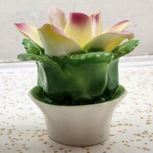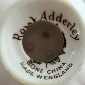 Vintage Bone China Salt & Pepper Shakers. Royal Adderly. Floral Motif. Made in England. Yellow Floral shaker has a misprint of the label as seen in photo illustrations. Both have a few small chips here and there but still very lovely. Small-only 2 inches tall aprox.