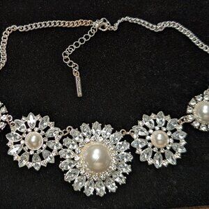Cezanne Vintage Flower Statement Necklace, White Rhinestones, Beautiful Faux Pearls. 5 flowers