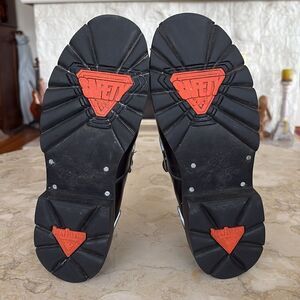 In very good preowned in condion rare vintage Fluevog Austin safety hogs leather loafers. These are chunky, with a steel tie, lug soles and reflective details. Leather lined.