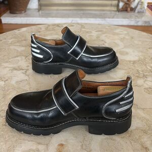 In very good preowned in condion rare vintage Fluevog Austin safety hogs leather loafers. These are chunky, with a steel tie, lug soles and reflective details. Leather lined.