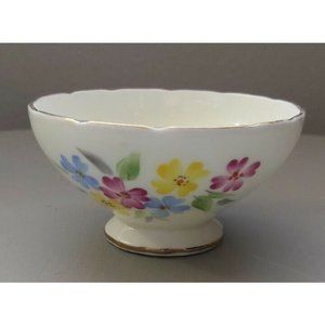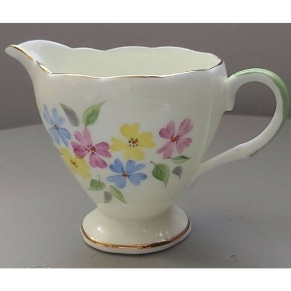 Vintage Foley Bone China, White Cream and Sugar set with blue, yellow and purple flowers, made in England. In great condition for their age. Gold rim is slightly aged on sugar bowl also shown in photos. No chips or cracks or crazing. Add these pieces to your collection today!