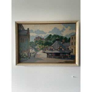 Vintage Folk Art Framed Needlepoint featuring a charming country side scene. This handmade piece showcases intricate needlepoint work that adds a touch of traditional craftsmanship to any space. The framed design adds a classic touch, making it a perfect addition to your home decor. This unique piece of finished embroidery captures the essence of rural life in a timeless and nostalgic way. Ideal for collectors or those looking to add a touch of vintage charm to their living space.